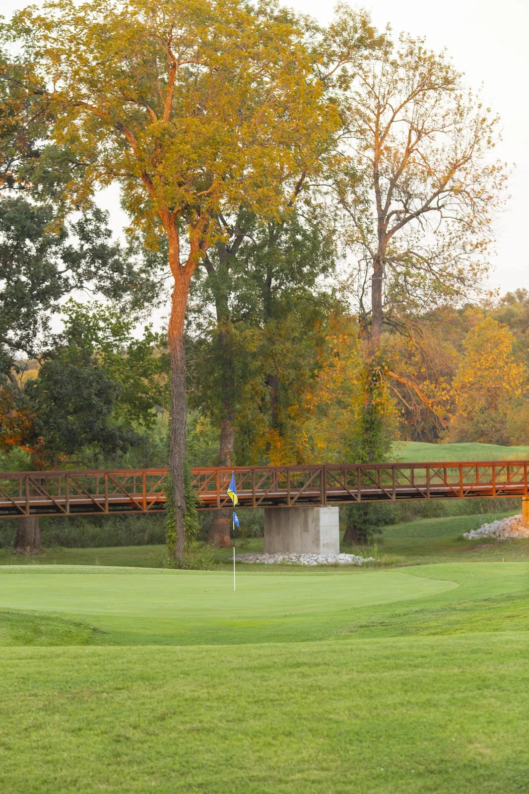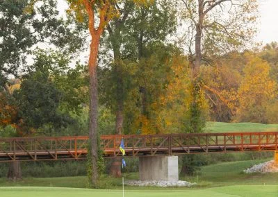 One of the most scenic holes on the golf course. This challenging par 3 requires a tee shot over the river onto a two tiered green. A grassy bowl on the right will find many missed hit tee shots.